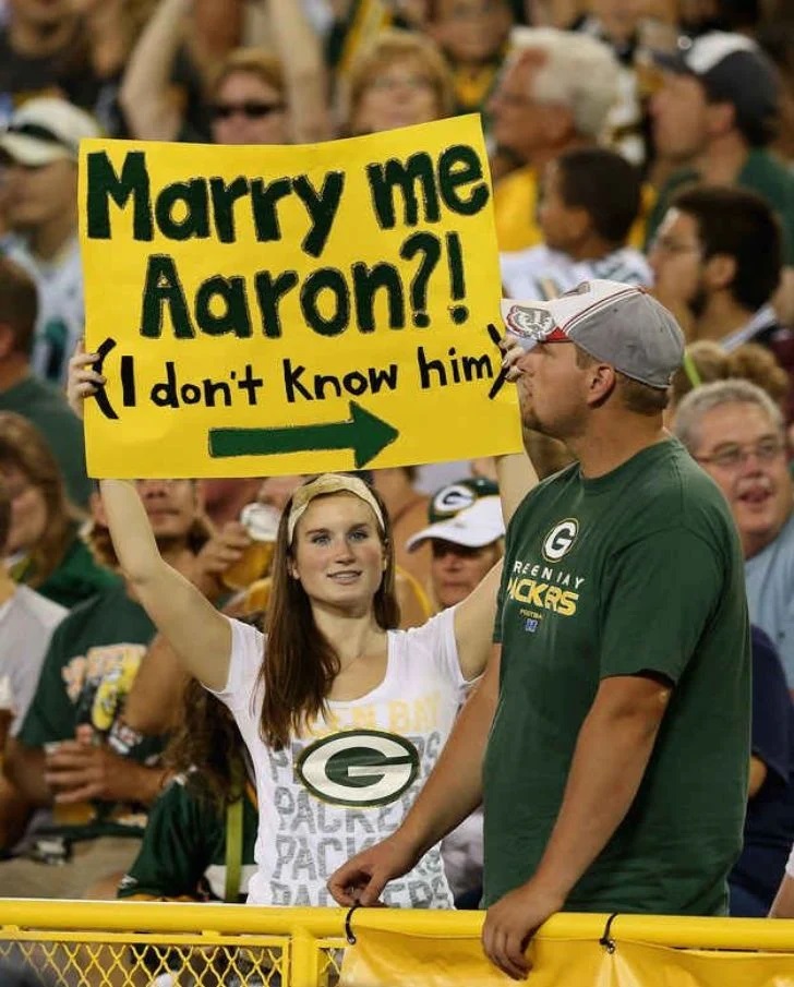 不容錯過的運動時刻 一場奇特的求婚 Advertisements 這位在 Green Bay Packers 隊比賽現場的女士,毫不含糊地表明她已經受夠了她的伴侶,寧願嫁給四分衛 Aaron Rodgers。比賽期間,她舉著一個牌子,上面寫著「Aaron,娶我好嗎?!」,同時指著她的伴侶,並附註「我不認識他」。不過,這牌子大概只是開玩笑的啦。 Advertisements 上頁下一頁 真想知道,在經歷了這麼多幽默和這種非傳統的關注方式之後,這兩人的關係會如何發展。最幸福的情侶總能在他們的關係中保持他們的魅力和幽默感。 Advertisements PREV NEXT PAGE
