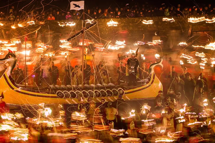 シェトランド諸島では、冬の終わりをヴァイキングスタイルで締めくくる「アップヘリーアー」が盛大に行われます。地元の人々は北欧の戦士の衣装を身につけ、松明を持って町を行進し、最終的にはヴァイキング船のレプリカに火を放ちます。これは、歴史再現劇であり、炎の祭典であり、そして何よりも壮大なイベントです。