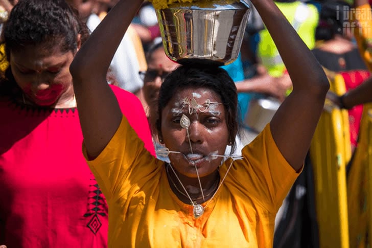 マレーシアの同名の祭りと同じく、シンガポールのタイプーサム祭では、ヒンドゥー教の信者がフック、棒、串などで体に穴を開け、しばしばそれらを装飾されたカバディ構造物に取り付けます。これは肉体的に過酷で視覚的にも強烈な献身の行為です。