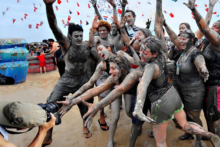 ミネラル豊富な泥で作られた化粧品を宣伝するためのマーケティング戦略として始まったものが、巨大な泥投げパーティーへと発展しました。保寧で開催され、何千もの人々がビーチでとろとろの灰色い泥のプールで泳ぎ、レスリングし、滑り込みます。春休みと沼地レスリングが融合したようなものです。