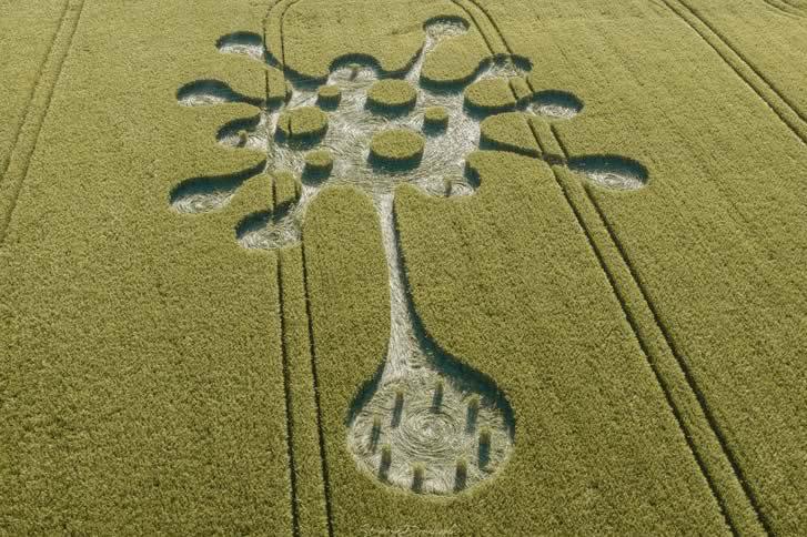 圖片中的麥田圈是在2020年被發現的,因其形狀酷似冠狀病毒而引起關注。新冠病毒在全球蔓延已經兩年多了。有些人認為,這可能是無聊的農民為了找樂子而投資製作的。如果有人沉迷於TikTok或Dalgona咖啡,那麼農民也有他們打發時間的方式吧。