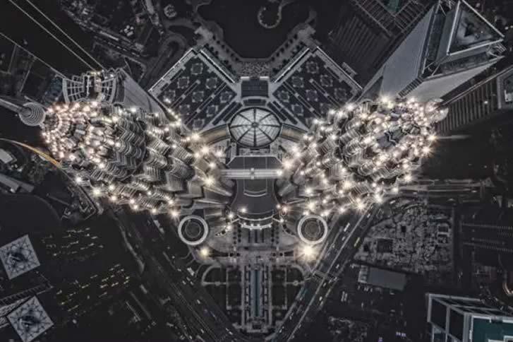攝影師 Tomasz Kowalski 就是一個例子。他使用無人機從空中拍攝建築物,讓它們看起來就像外星人的構造。實際上,這棟建築物是位於馬來西亞,世界上數一數二高的「雙子星大樓」。這張照片營造出彷彿透過萬花筒看見的奇幻氛圍。