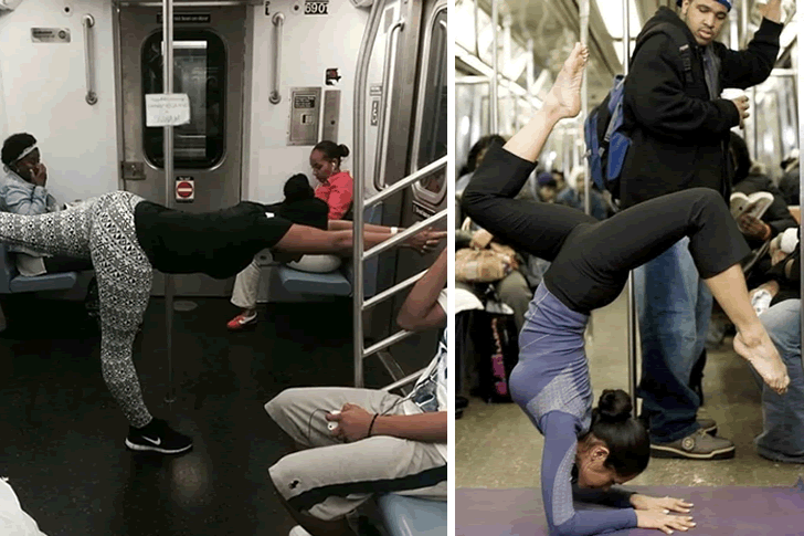 しかし、公共の地下鉄の中でこれを行うのは、最良の選択とは言えないかもしれません。写真で見られるように、外部からの邪魔はどこにでもあります。ここで誰かを責めるつもりはありませんが、この女の子が、もっと良い場所と時間を見つけて、ストレッチをすることを願っています。