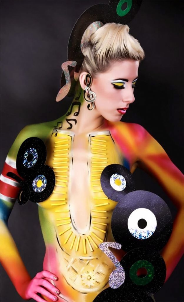 これは、私たちの人生を喜びで満たしてくれる音楽の旋律への賛歌です。テーマは音楽なので、彼女の首には音符が描かれています。イヤリングも、キラキラ光る素材で音符のデザインになっています。さらに、この女性の体や髪には、レコード盤の切り抜きがあしらわれています。