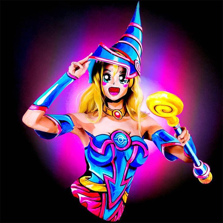 このダーク・マジシャン・ガールの描写は、Kay Pikeによって作成されました。この演出では、彼女はアニメ「遊☆戯☆王」の有名なキャラクター、魔法の才能を持ち、テレパシーで他人とコミュニケーションできるキャラクターになりきっています。