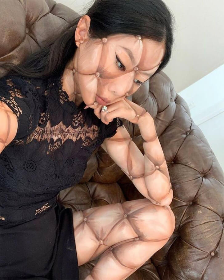この女性のボディペイントは、まるで家具と徐々に融合していくかのように見えます。彼女の肌には、レザーソファーのひし形の模様が再現されています。ソファーの茶色の色合いはまだありませんが、これは進行中のプロセスの一部なのかもしれません。