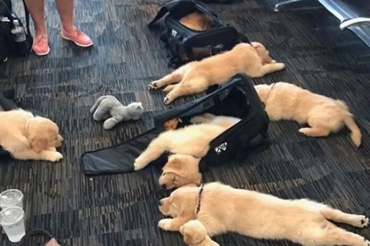 隨意放置在熟睡幼犬旁的水杯和錢包,更增添了超現實的魅力。這裡感覺不像安檢站,更像托兒所的午睡時間。無論牠們是訓練中的服務犬,還是隨行的小狗家族,有一點是肯定的——這些幼犬那天搶盡了風頭,可能也偷走了每一位乘客的心。