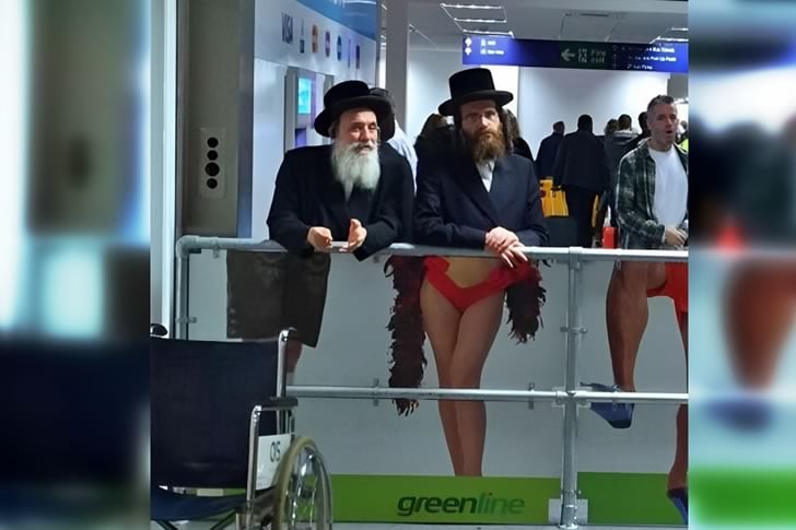 乍看之下,一切都顯得再正常不過了——兩位紳士在機場欄杆上隨意地靠著。但再仔細一看,你就會發現一些令人莞爾的奇異之處。欄杆下方的廣告巧妙地擺放,創造出一個爆笑的視覺錯覺。它讓這些穿著得體的男士看起來像是穿著紅色泳裝和羽毛圍巾,而非傳統的黑色西裝。結果呢?一個讓人捧腹大笑的瞬間,讓每個路過的人都忍不住回頭再看一眼。