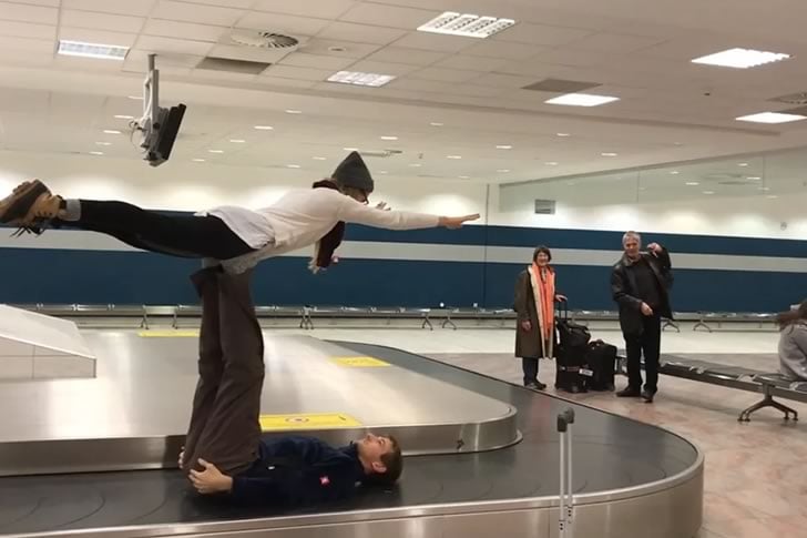 Dans l’univers généralement monotone de la récupération des bagages, un duo de voyageurs a décidé de transformer la frustration en performance artistique. L’un est allongé à plat sur le tapis roulant des bagages tandis que l’autre est parfaitement en équilibre sur ses pieds dans toute sa splendeur d’acroyoga. Cette scène ressemble plus à un numéro de cirque ambulant qu’aux conséquences d’une valise perdue. Leur choix de lieu – un tapis roulant tournant – ajoute à la fois suspense et spectacle, captant l’attention des passagers à proximité et faisant tourner les têtes pour les bonnes raisons.