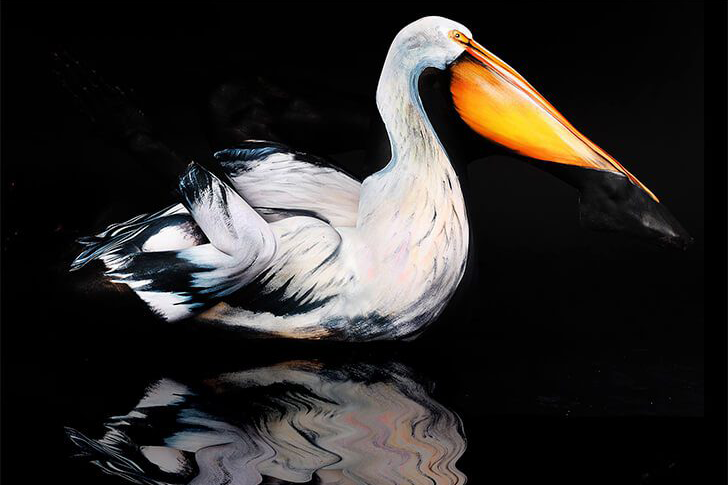 Body painting is an art form that turns the human body into a canvas. In the image above, precise painting techniques and a clever setup have transformed the body into a deceptively realistic pelican.