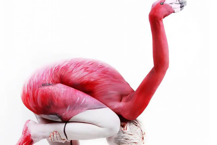 A passionate body painting artist has transformed themselves into a flamingo – a tribute to the elegant pink bird with its distinctive one-legged stance. The colorful design not only mirrors the feathers but also the grace of these birds, which get their pink hue from carotenoids in their diet.