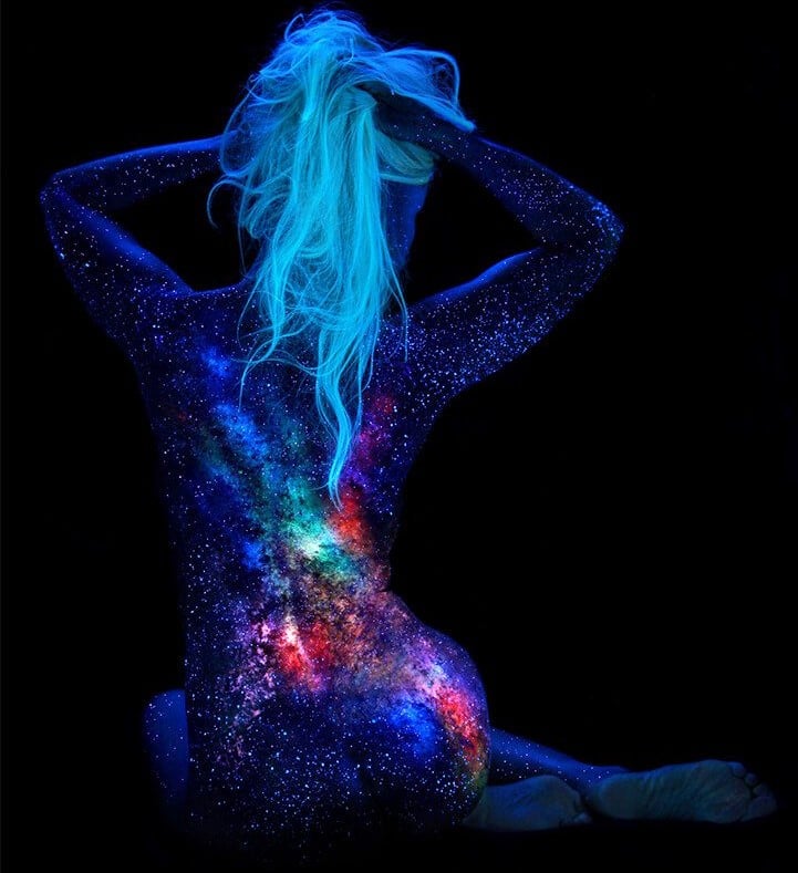 Under black light, the full effect unfolds: the UV colors glow in violet, green, and blue brilliance, as if the body contains a section of the Milky Way. The principle: UV light excites the fluorescent pigments, which convert energy into visible light. A cosmic trick that shows: the beauty of the galaxy lies not only in space, but also on the skin of an artist who can paint stars.