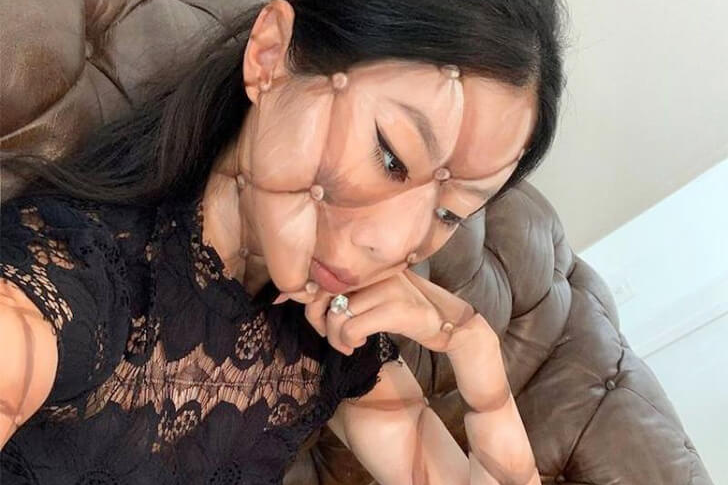 With sensitive body painting, this artist lets her body “merge” into a leather sofa: the diamond-shaped quilted pattern of the furniture extends like a second skin over her face, arms, and legs. The nuances of gray, brown, and beige mimic the texture of the leather – still without the typical brown coloration, which may be planned as the next step.