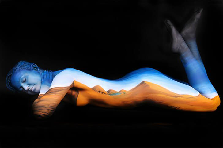 The artist uses her body as a canvas to depict the picturesque beauty of a desert. She paints sand dunes, an oasis, and even camels approaching the water. Camels are a common means of transport in the desert and play an indispensable role in the lives of Bedouin nomads.