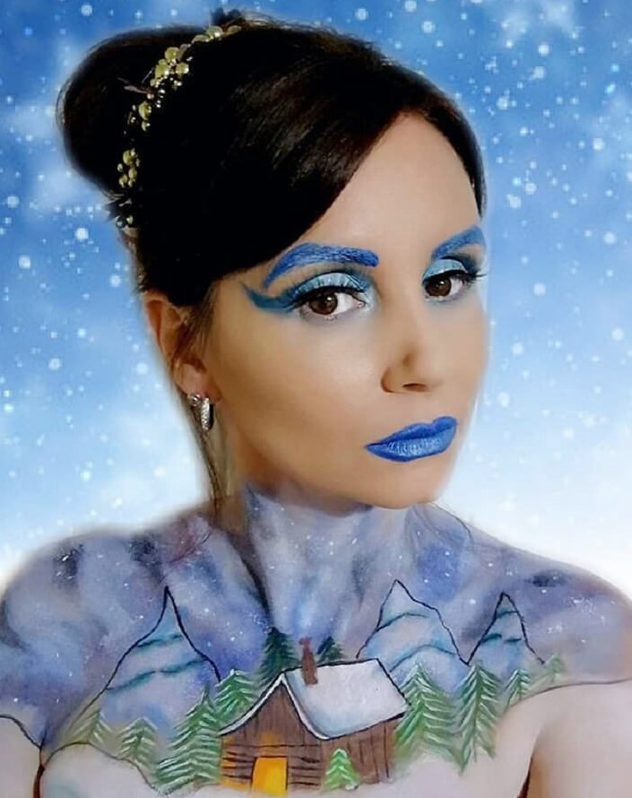 Ihre Leidenschaft liegt in der Schaffung von Illusionen – sie loves es, Menschen mit ihren Kreationen zu verblüffen. Hier kombiniert sie kühle Farbtöne wie Blau- und Weißnuancen, um eine heimelige Hütte in einem schneebedeckten Wald darzustellen. Die Details wie der “Schnee”, der auf den Bäumen glitzert, verstärken den märchenhaften Charakter der Szene.