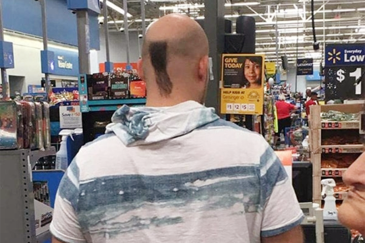 Wir können uns nicht sicher sein, ob dies eine absichtliche Frisur ist oder ob er versucht, das letzte Haarstück zu halten. Während viele Leute zu einem Hut greifen würden, um solche Haare zu verbergen, bewundern wir ihn für sein Selbstvertrauen, so in die Öffentlichkeit zu gehen.