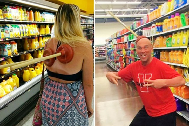 Nur weil man Lebensmittel einkauft, heißt das nicht, dass man keinen Spaß haben kann! Es gibt eine dünne Linie zwischen einem angenehmen Moment und das Erschöpfen der anderen mit Unsinn. Wenn ich diese Leute in Walmart sehe, würde ich wahrscheinlich einen anderen Gang ausprobieren.