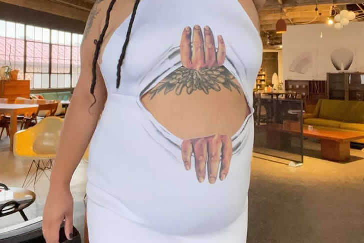 Dieses Kleid schien zu sagen: „Subtiles Schwangerschaftsleuchten? Nie gehört!“ Die aufgedruckten Hände sehen aus, als würde jemand dramatisch einen Vorhang aufreißen, nur um den Babybauch live auf der Bühne zu präsentieren.