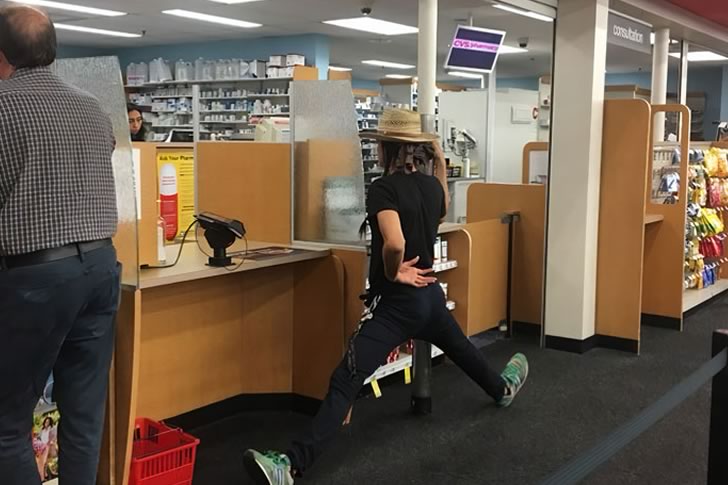 While everyone else seems content to stand upright, this person clearly decided that if they were going to wait, they might as well stretch. It’s equal parts bizarre and brilliant, a reminder that public spaces are often stages for unintentional comedy. Whether it’s a performance, a prank, or just a really intense lunge break, one thing’s for sure: no one in that line will forget this trip to the pharmacy anytime soon.