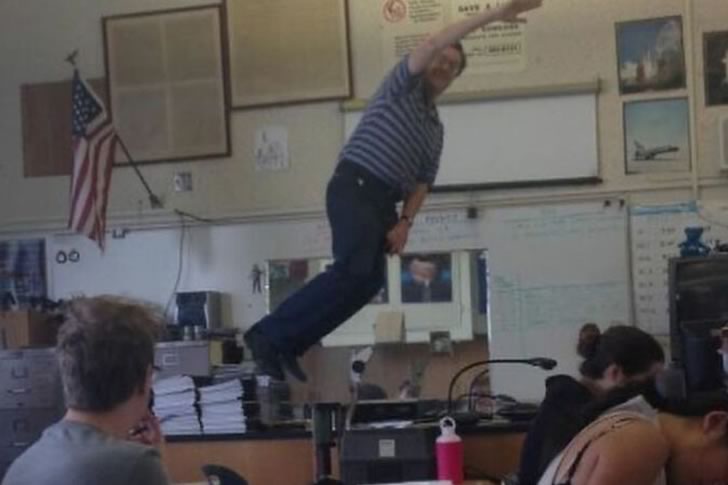 This teacher might just be redefining the laws of physics, or at least it looks that way. Captured mid-motion—or mid-magic, depending on your interpretation—he appears to be effortlessly levitating above his desk like a superhero making a dramatic entrance. His arm is stretched forward like he’s flying through the classroom, turning an ordinary day of lessons into a scene straight out of a comic book.