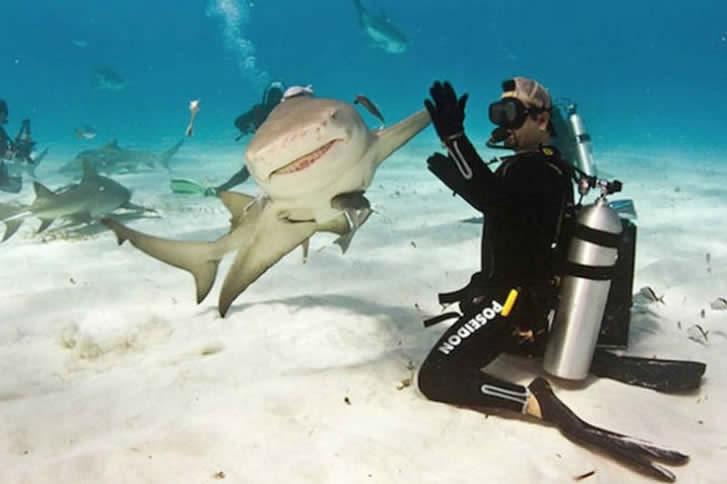 そんな中で、サメとハイファイブをするというユニークな瞬間を捉えたこの写真は、思わず笑顔がこぼれるシーンを見せてくれます。ダイバーの勇気と遊び心が、深海という未知の世界をさらに魅力的な冒険に変えています。そして、この瞬間は家族のアルバムに残り、特別な思い出として永遠に語り継がれることでしょう。