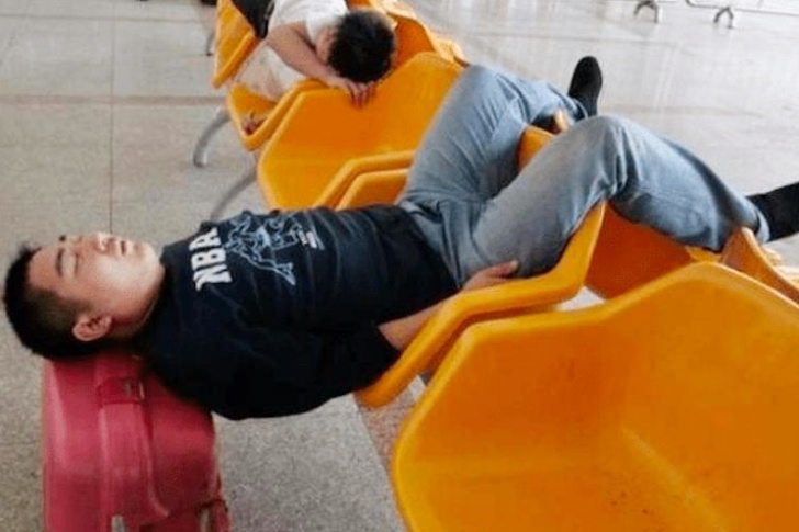 This gentleman came up with a rather unconventional solution. He opted to use his suitcase as a backrest and another seat to support his lower body. Sure, it appears far from cozy, but considering he’s sound asleep, it must be more comfortable than the alternatives around him.