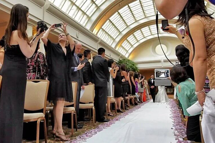 La tecnología es genial, siempre y cuando no estorbe. Como aquí: mientras la novia caminaba hacia el altar, una espectadora levantó su iPad para filmar el evento. El resultado: un campo de visión bloqueado y un momento fotográfico perfecto arruinado.