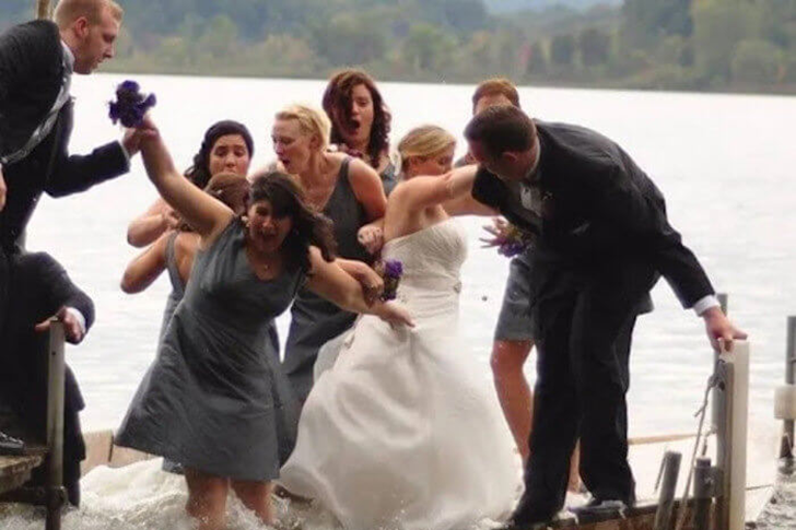 Fotos de boda idílicas junto al lago: una idea de ensueño. Pero aquí, el clima cambió repentinamente: cuando el grupo de la boda se apiñó en la pequeña plataforma, hubo un repentino “crack”, y de repente las olas barrieron la madera.
