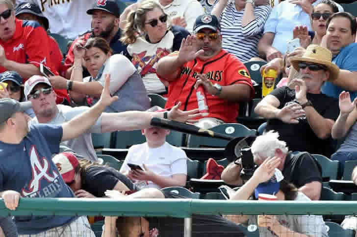 画面の中央にいる赤いシャツを着た紳士や、大きなビールを手にしている男性に目を向けているなら、実は違うところを見ているかもしれません。この写真の本当のヒーローは、左下にいるお父さんです。このお父さんは、まさに本能的に自分の腕を差し出して、子供が顔に野球バットを受けるのを防いでいます。その姿勢が、彼の父親としての献身を物語っています。