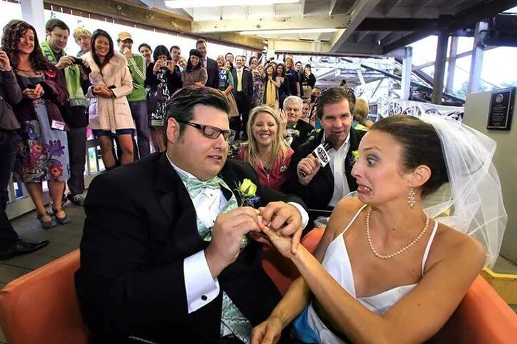 The expression of utter despair on the bride’s face allows for two interpretations: Either two journalists are reporting on her wedding, or she’s on the verge of a lifelong decision—while sitting on an object that looks like a slide. The scene appears to be a “perfect backdrop, wrong moment” for the reporters. Many questions remain unanswered: Was this inclusion planned? And why exactly these two on TV?