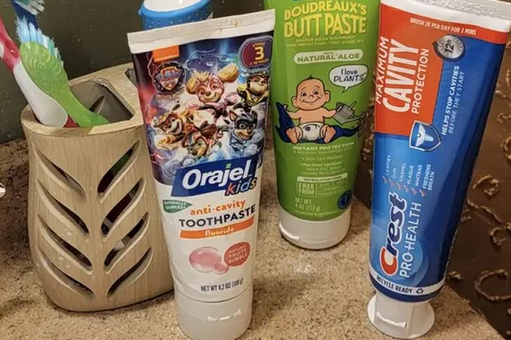 On the surface, this bathroom counter looks like a typical family setup — a couple of toothbrushes, some toothpaste for the kids, and one glaring green tube that absolutely does not belong next to oral hygiene products. Boudreaux’s Butt Paste might do wonders for diaper rash, but it’s not something you want anywhere near your toothbrush. The fact that it’s the same size and shape as the toothpaste makes this setup a disaster waiting to happen.