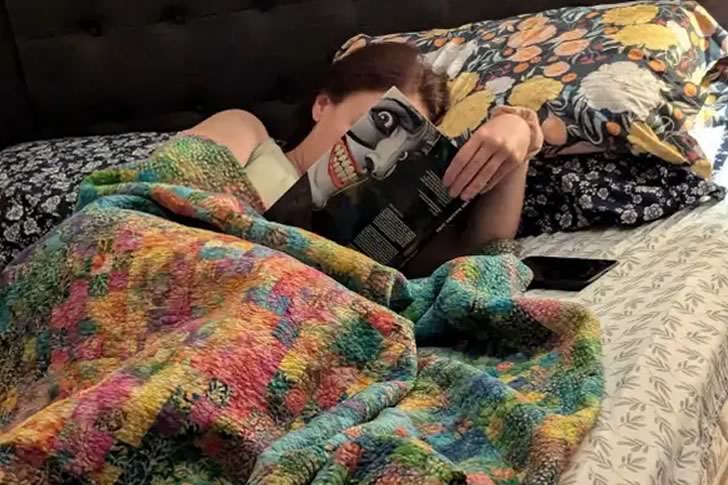 It’s a classic case of timing and positioning gone hilariously wrong. This kind of accidental horror-movie moment could definitely give a roommate a heart attack if they walked in unprepared. Sometimes, all it takes is the right book and a sleepy reader to turn bedtime into a jump scare.