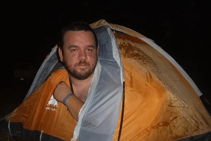 His expression says it all: resignation, mild amusement, and perhaps a deep, slow-bubbling regret. But you have to admire the commitment. Most people would’ve driven back to the store or at least tried to sleep in the car. Not this guy. He zipped himself in, shoulders bursting at the seams, proving once and for all that while tents might have size limits, human patience—and humor—do not.