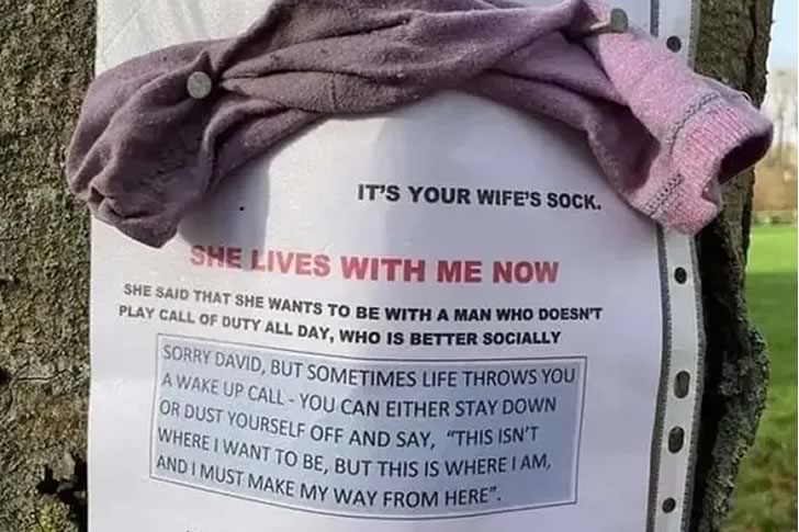 There are breakups, and then there are public declarations nailed to a tree involving a sock and passive-aggressive motivational quotes. David, wherever you are, someone really went out of their way to let you—and the entire neighborhood—know that your gaming habits may have cost you more than just a few hours of sleep. This mystery man’s bold approach combines heartbreak with a splash of pettiness, proudly announcing he now lives with David’s wife… and her sock.