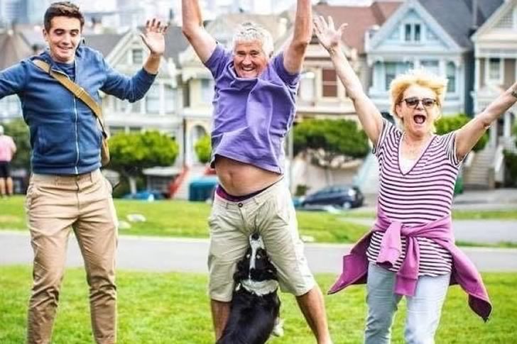What was meant to be a cheerful family jump shot turned into a moment of hilariously painful misfortune. Caught at the exact moment of lift-off, this photo shows three happy people mid-jump with smiles, joy, and raised arms—except for the man in the middle, whose airborne celebration was abruptly interrupted by his enthusiastic dog. The pooch, perhaps trying to join in the fun, leaps up at just the wrong (or right?) moment, landing squarely where no dog should ever land.