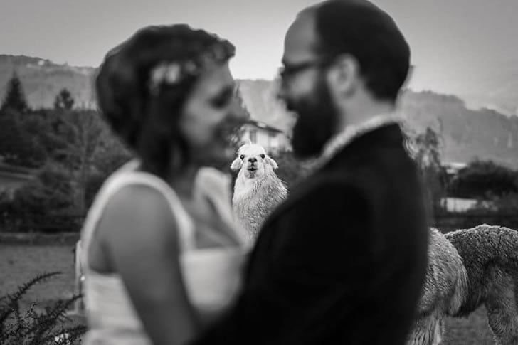 Set on what appears to be a peaceful llama farm, the couple prepares for a whimsical and fun wedding photo. But one llama has other ideas—it stops and stares directly at them, clearly confused by the unfamiliar visitors.
