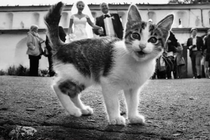 Just as the couple prepared for a sweet, romantic shot, their cat jumped right in front of the camera. With huge, surprised eyes, it stared directly into the lens, completely blocking out the bride and groom behind it.