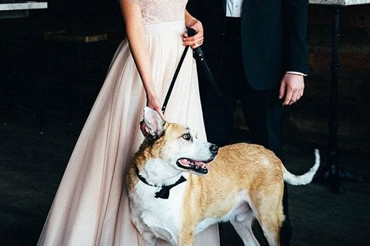 In a dimly lit venue with a brick wall and quirky decor, a bride and groom pose with a dog on a leash. The dog, wearing a bow tie, outshines the couple’s formal attire with its playful grin and confident stance. The stylish interior adds ambiance, but the dog captures everyone’s heart.