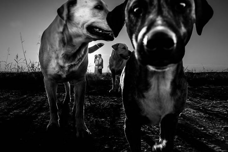 A primera vista, la foto parece centrarse en una hermosa pareja posando junta. Pero una segunda mirada revela dos perros que miran confiadamente a la cámara, como si supieran que era la hora de la foto. Se paran con tanta compostura que casi parecen guardaespaldas.