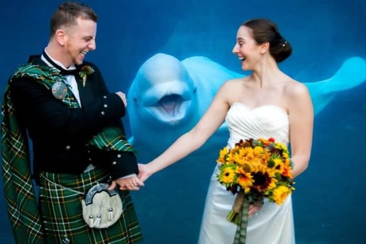 En un encantador lugar submarino, la pareja posa amorosamente junto al cristal de un gran acuario. De repente, una ballena beluga se desliza al fondo, con su cara curiosamente pegada al cristal como si dijera: “¡Felicidades!”