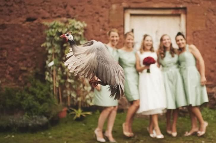 Justo cuando la novia y las damas de honor están listas para su foto, una gallina de guinea cruza volando el encuadre. Sus alas se difuminan en el aire en el momento exacto en que la cámara dispara, creando una imagen única en la vida.