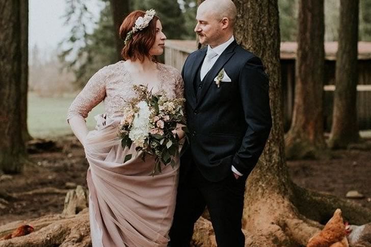 En un encantador entorno forestal, una pareja de novios se encuentra junto a un imponente árbol, sus elegantes atuendos contrastando con el entorno rústico. Alrededor de sus pies hay una bandada de curiosas gallinas, picoteando el suelo y llamando la atención con su inesperada presencia. El delicado ramo de la novia y el impecable traje del novio quedan momentáneamente eclipsados mientras las gallinas añaden un toque caprichoso a la escena de la boda.