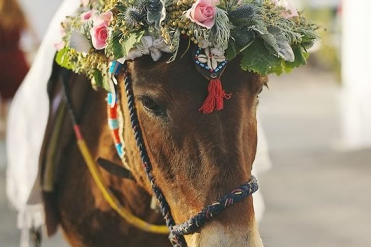 En un sendero soleado, un burro adornado con una corona floral se erige como el centro de atención, guiado por un cuidador cerca de un escenario de boda. La intrincada decoración del burro eclipsa el sutil fondo, atrayendo la atención con su llamativa apariencia. Los novios, aunque elegantemente vestidos, quedan en un segundo plano mientras la belleza del burro cautiva el momento.