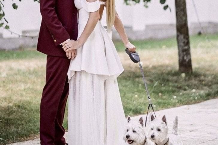 Bajo un dosel de árboles verdes, una pareja de novios se da un beso mientras sostienen las correas de dos adorables perros. Los perros, adornados con collares florales, se roban el protagonismo con sus poses afectuosas, añadiendo calidez a la escena romántica. Los elegantes atuendos de la pareja son encantadores, pero la presencia de los perros aporta un toque extra de ternura.