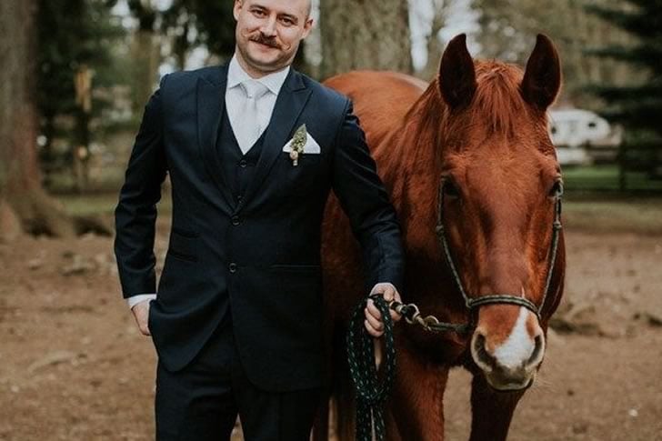 En una zona boscosa con heno esparcido, un novio posa con confianza junto a un majestuoso caballo. La imponente presencia del caballo eclipsa el elegante traje del novio, atrayendo admiración con su grácil postura. El entorno natural realza la escena, pero el caballo se convierte en la estrella indiscutible de este momento nupcial.