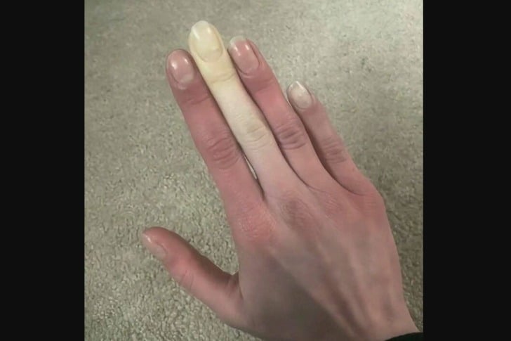Usually Reynaud’s phenomenon it’s kinda blue/white/red and it’s not focus on a specific finger (in general)