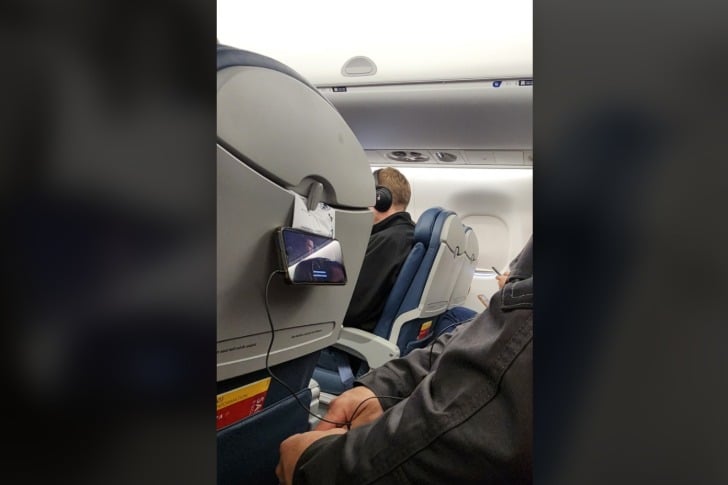 #27 Mann im Flugzeug steckte seine Bordkarte in seine Handyhülle und hielt sie mit der Verriegelung des Klapptisches fest