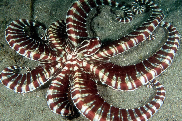 The mimic octopus is a small, brownish cephalopod with smooth skin and the ability to change color and texture instantly. It lives in the shallow muddy seabeds of Indonesia and Southeast Asia, usually staying under 2 feet long.