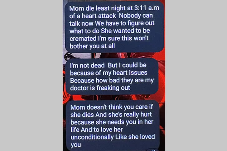 J’ai reçu un texto de mon frère qui s’est avéré être ma mère qui textait depuis le téléphone de mon frère. Je ne lui ai pas parlé depuis une semaine parce qu’elle était raciste et qu’elle proférait toutes sortes de menaces.