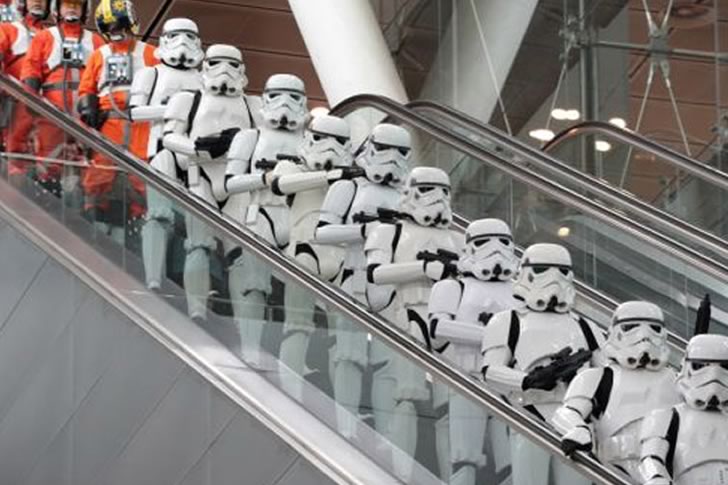 In a scene that looks like it was plucked straight from a galaxy far, far away, this group of Stormtroopers descending the airport escalator is both unexpected and hilarious. Whether they’re on their way to a Star Wars convention or just grabbing a connecting flight to the Death Star, their synchronized presence among ordinary travelers turns a routine airport moment into a sci-fi spectacle. It’s not every day you see galactic soldiers casually cruising through a terminal.